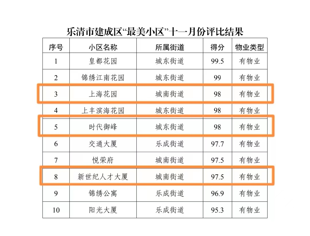 根據(jù)《2022年樂清市創(chuàng)建全國縣級文明城市工作實施方案》(樂委發(fā)〔2022〕24 號)要求,在建成區(qū)范圍內(nèi)開展的十一月份“最美小區(qū)”評選中,我司在管項目,上海花園,時代御峰,人才大廈榜上有名,其中時代御峰與人才大廈均已多次入選。